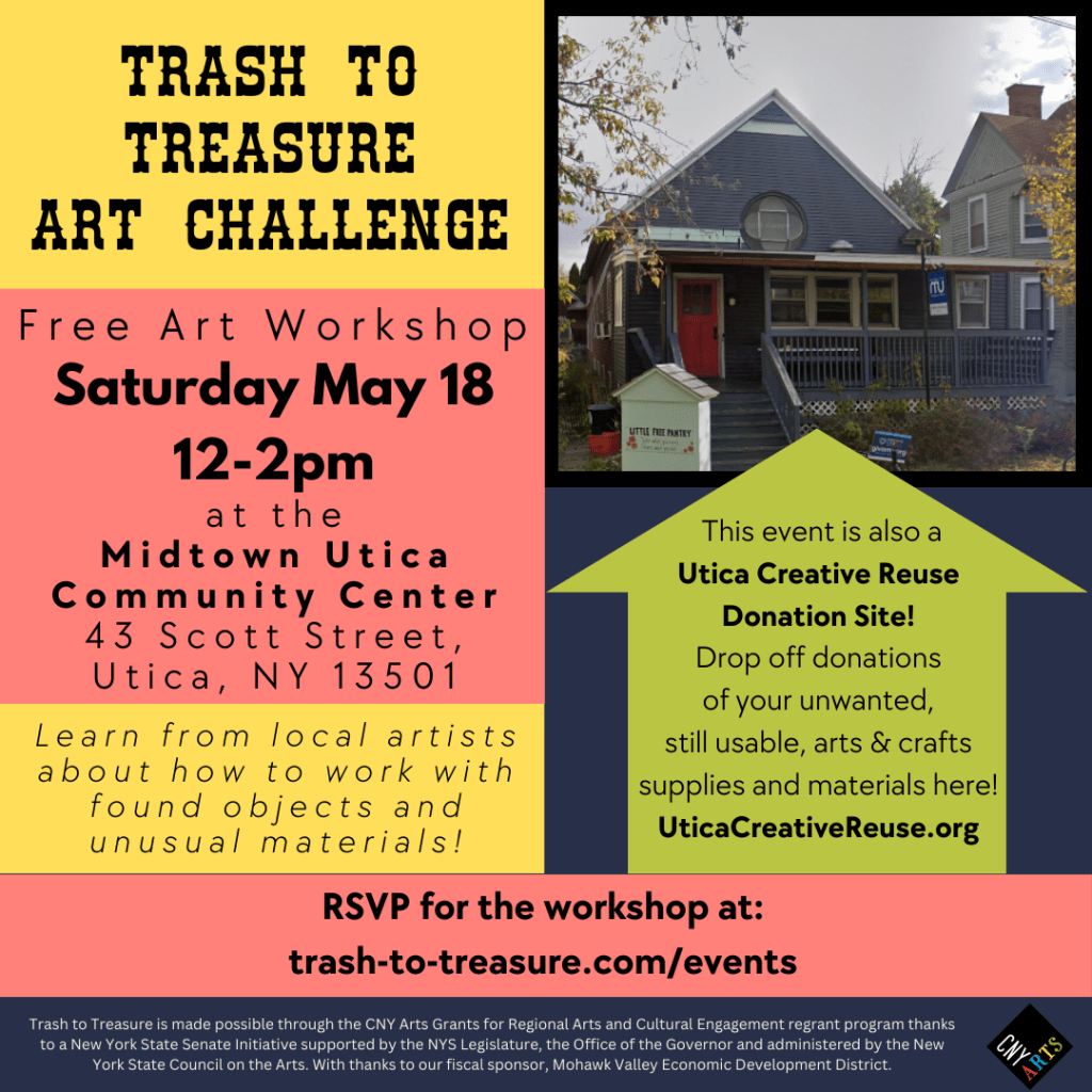 What: Free workshop hosted by local artists to help inspire and assist you in working with found objects, unusual materials, and trash for participating in the 2024 Trash to Treasure Art Challenge.