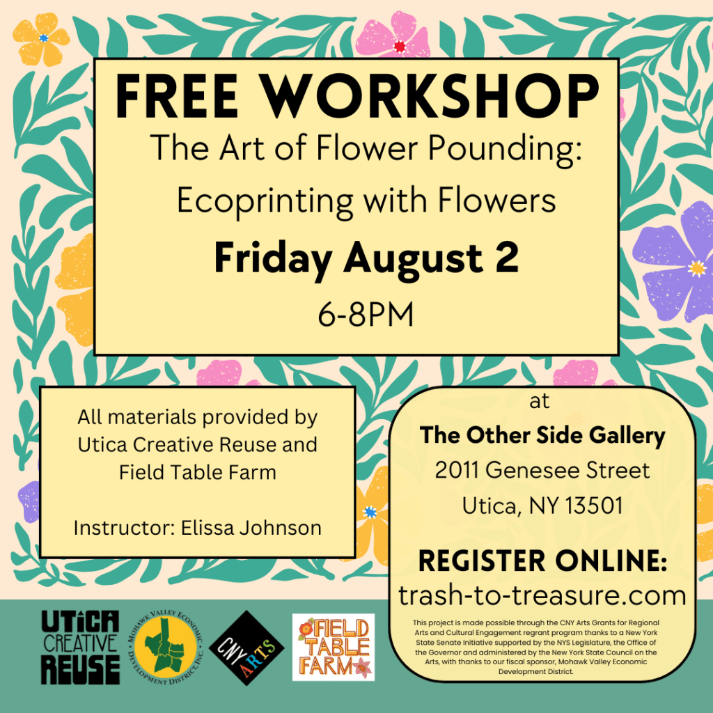 What: Free workshop! Learn the art of flower pounding and how to ecoprint with flowers.